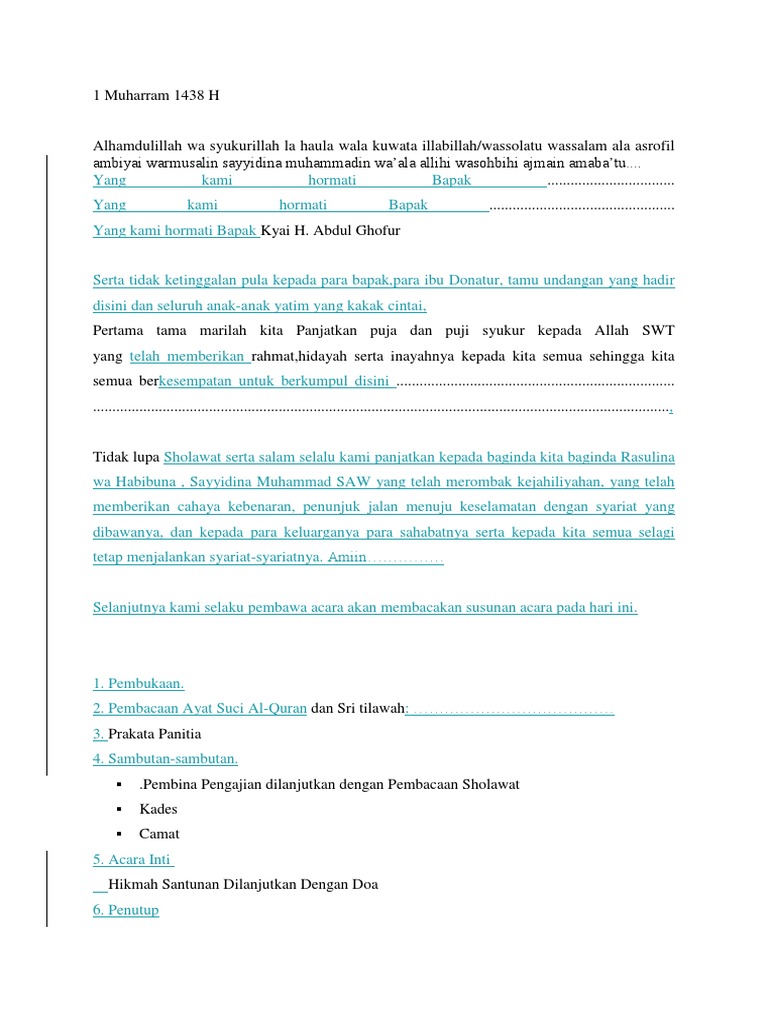 Semoga acara ini bermanfaat dan kita terus saling berbagi. Contoh teks mc/ pembawa acara santunan anak yatim piatu link : Masjid baitul jannah rw perum permata tangerang format 741 x 1112 pixel. 1952017 sehingga pada malam hari ini kita dapat berkumpul bersama dalam pengajian program santunan anak yatim di masjid al azhar potrobawan. Contoh teks mc acara hut ri 17 agustus bahasa jawa. Membantu dan meringankan kehidupan anak yatim piatu 2. Teks pembawa acara santunan anak yatim bahasa jawa. Contoh naskahteks sambutan sebagai pembawa acara mc contoh teks pembawa acara menjadi pembawa acara atau mc sebenarnya bukanlah hal yang sulit hanya saja bagi anda yang sebelumnya belum pernah mencobanya mungkin anda masih rada gugup dan. Contoh teks mc pembawa acara santunan anak yatim piatu assalamualaikum wr. Naskah / teks mc pembawa acara setengah resmi / video mc acara halal bihalal dan silahturahmi. Contoh teks mc pembawa acara santunan anak yatim piatu. Contoh teks mc/ pembawa acara santunan anak yatim piatu june 09, 2018 no comments contoh pidato sambutan ketua panitia dalam acara santunan yatim piatu june 07, 2018 no comments contoh pidato perpisahan untuk guru purnabakti atau pensiun june 14, 2018 no comments Tujuan dari susunan acara yaitu agar bisa membuat acara tersebut menjadi lebih teratur.